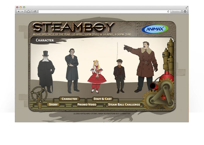 An interactive flash microsite for an anime "Steamboy" premium on Animax TV channel. The microsite included characters introduction, trailer video, interview and a flash game.