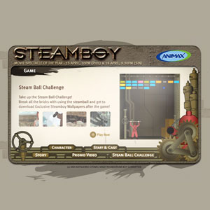 An interactive flash microsite for an anime "Steamboy" premium on Animax TV channel. The microsite included characters introduction, trailer video, interview and a flash game.